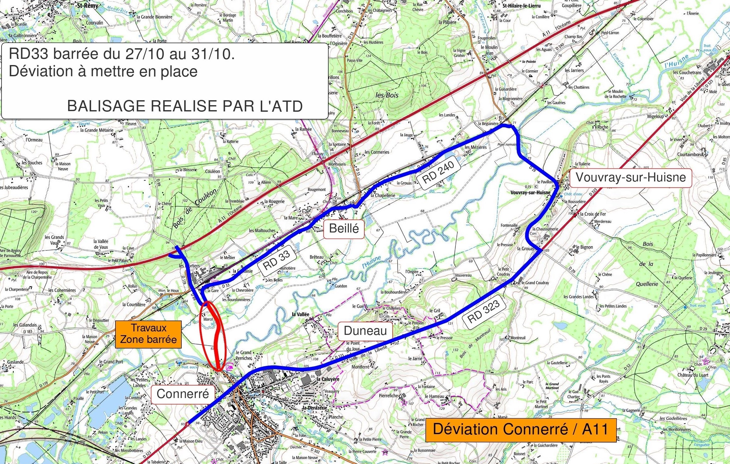 Du 27 au 31 octobre, la circulation sera donc déviée par Beillé et Vouvray-sur-Huisne. A l’issue de cette phase, la circulation sera rétablie sur la RD 33 avec une limitation à 50 km/h pour sécuriser les usagers sur ce tronçon en travaux avec un profil en travers non constant.
