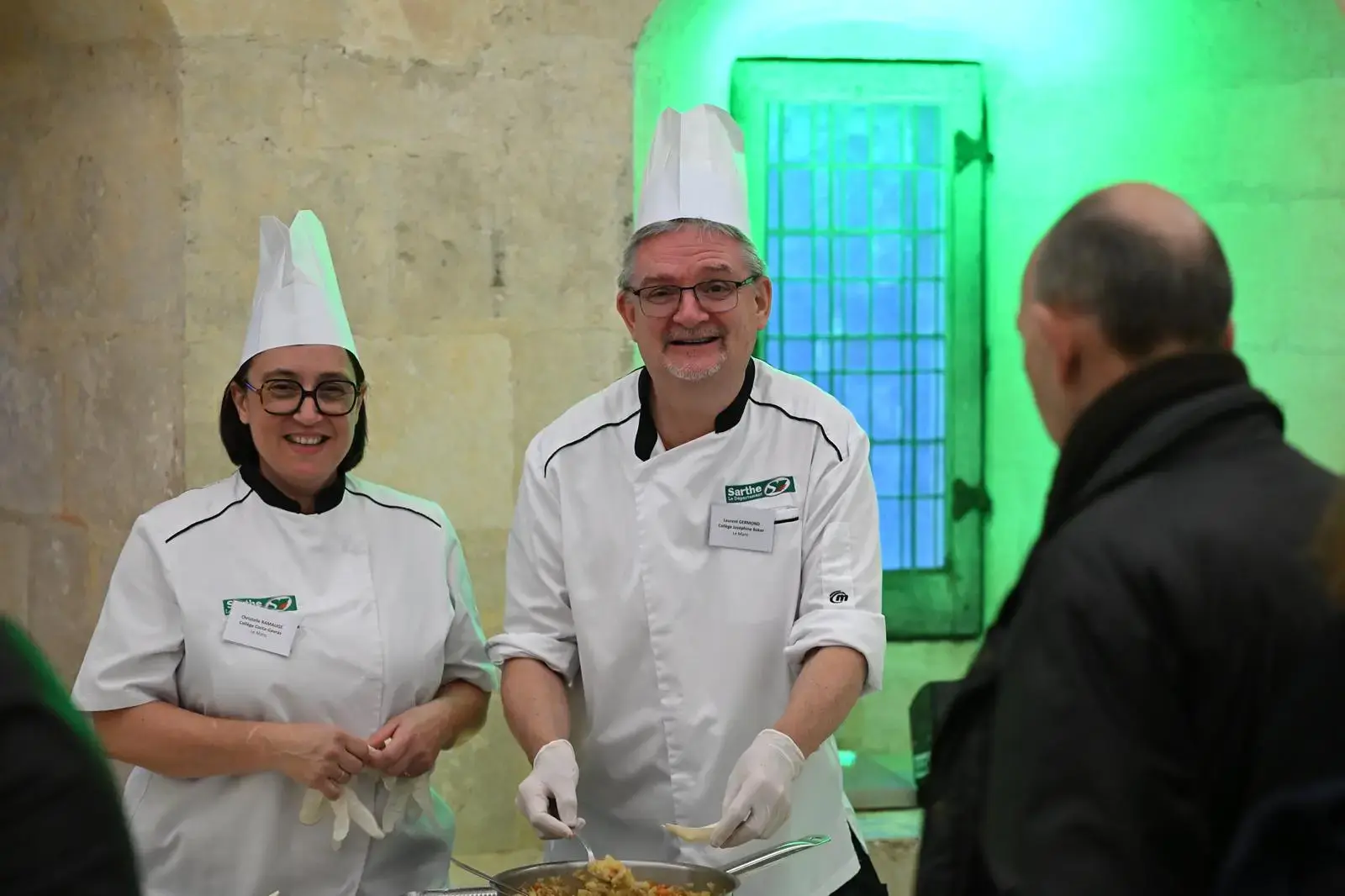À l’issue de la cérémonie, des chefs et seconds de cuisine des collèges ont pris le relais pour proposer des plats à base de produits locaux et mettre en avant la production sarthoise. Une cuisine gourmande, à l’image de la qualité de la restauration proposée dans les 56 collèges publics sarthois !