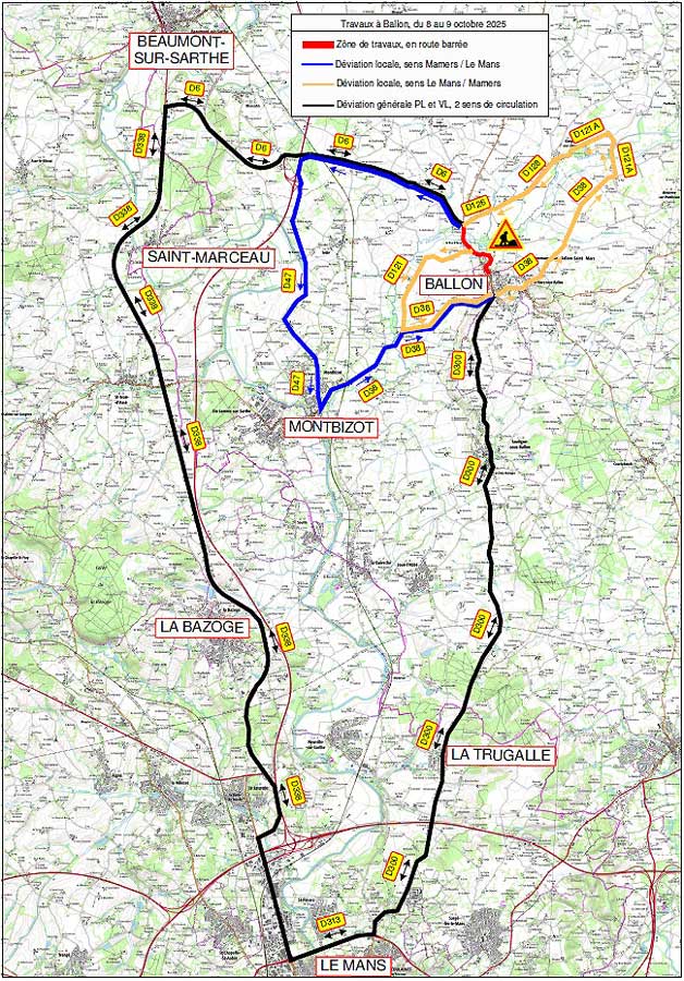 Le Département va renouveler le tapis d’enrobés de la route départementale 300 en et hors agglomération de Ballon-Saint-Mars « Rue d’Orne » et « Côte du Donjon ». Les travaux sont prévus du 8 au 9 octobre 2025 entre 8h et 18h.