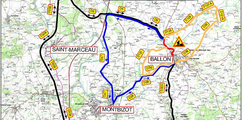 - Une déviation locale, section 1 -> RD 6- 47- 38 // Section 2 -> venant de Mamers RD 121 – 38, venant du Mans RD 38 – 121. (voir plan)