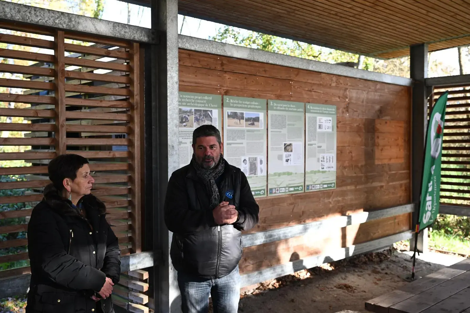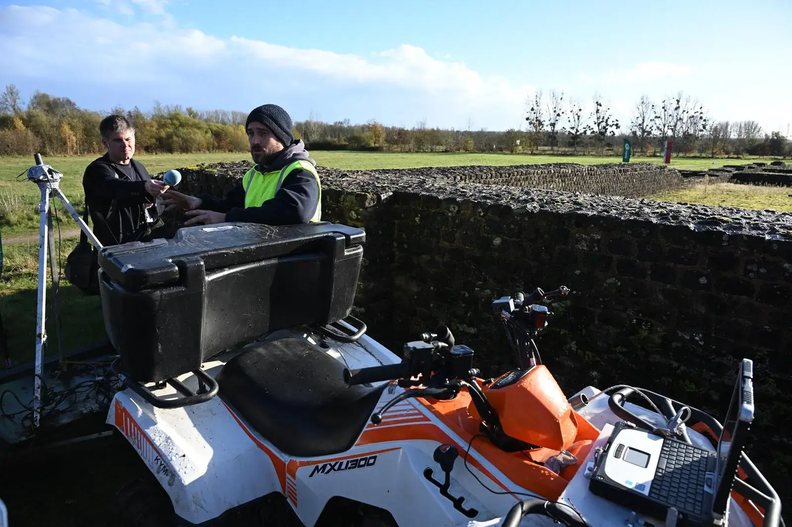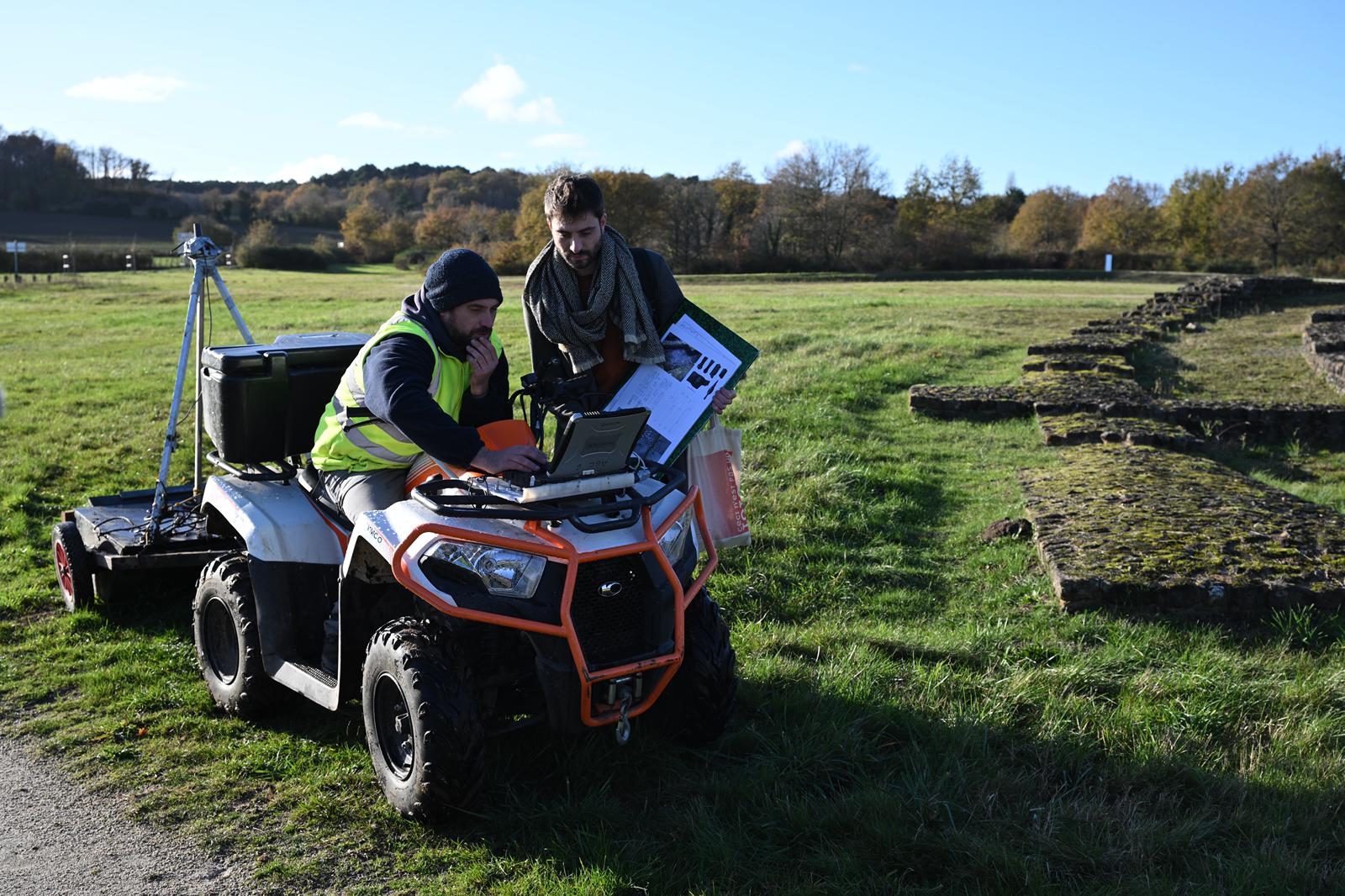 Brigitte Lecor, conseillère départementale du canton, Nicolas Mourier, maire d’Aubigné-Racan, Stanislas Bossard, archéologue au Laboratoire de recherche Archéologie et Architectures (LARA) de Nantes Université, et Gabriel Caraire , géophysicien société Agc, ont visité le site présentant les premières découvertes ainsi qu’une démonstration des techniques de prospection géophysique par les archéologues.