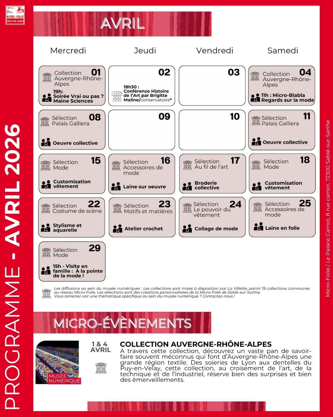 - Samedi 4 avril à 11h00 : Micro-blabla « Regards sur la mode », découverte artistique en 30 minutes.