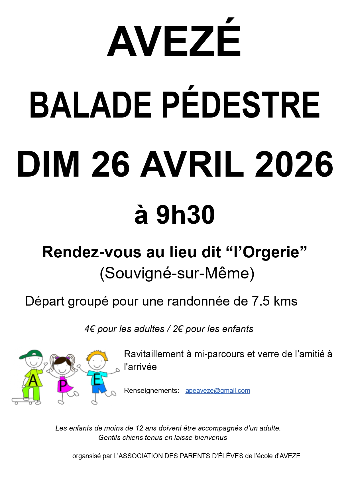 Organisé par l'association des parents d'élèves d'Avezé. Départ groupé pour une randonnée de 7.5km. Ravitaillement à mi-parcours et verre de l'amitié à l'arrivée.