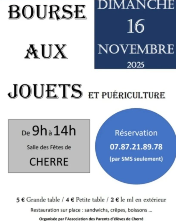 L'APE de Cherré organise sa bourse aux jouets et puériculture le 16/11/2025 de 9h à 14H à la salle Beauregard. Réservation par SMS au 07.87.21.89.78