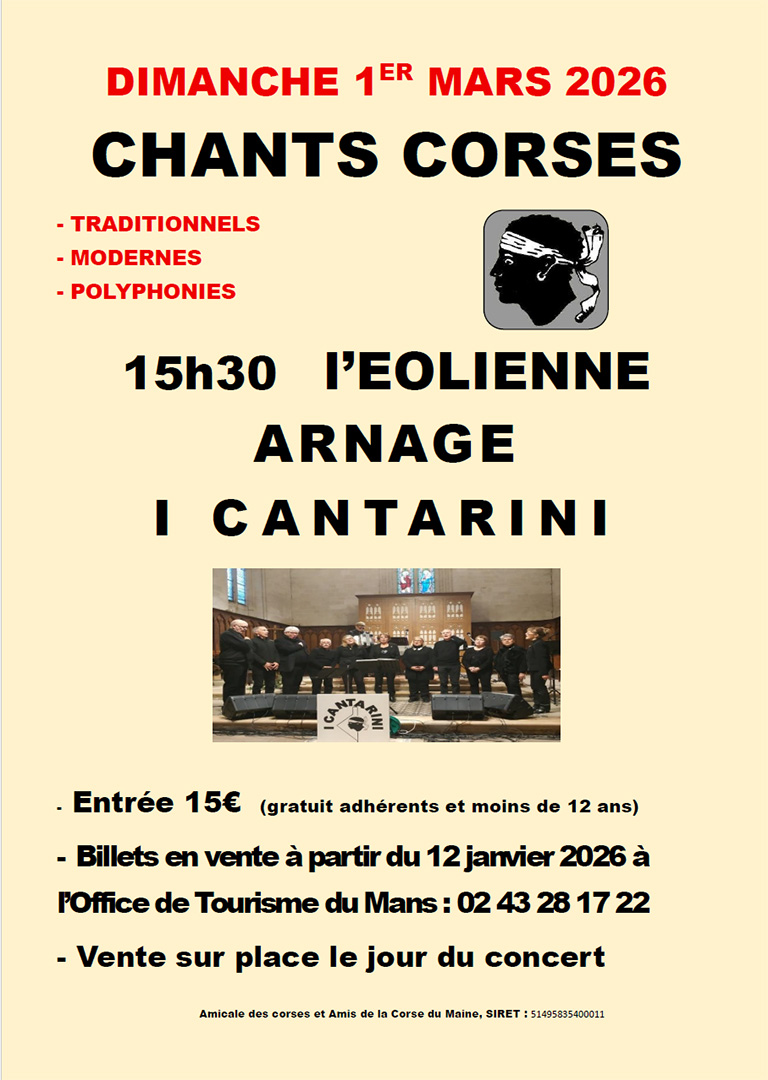 Au cours de ce concert « I Cantarini » présenteront en quelques titres l'histoire de la chanson corse. Leur registre vous transportera dans une ambiance corse où alternent chants de femmes, d'hommes, chants de groupe, accompagnés d'une musique typique avec guitare, accordéon, saxophone, violon, clavier électronique. Les chants traditionnels font partie du patrimoine de la Corse, mais on peut y découvrir également un échantillon de sa culture à travers un panel varié de ses chansons. Cette culture repose sur une longue tradition orale qui s'est enrichie au fil du temps de chants nouveaux plus modernes et rythmés, surtout depuis le riacquistu. Le riacquistu est cet élan de réacquisition de la culture identitaire intervenu depuis une cinquantaine d'années.