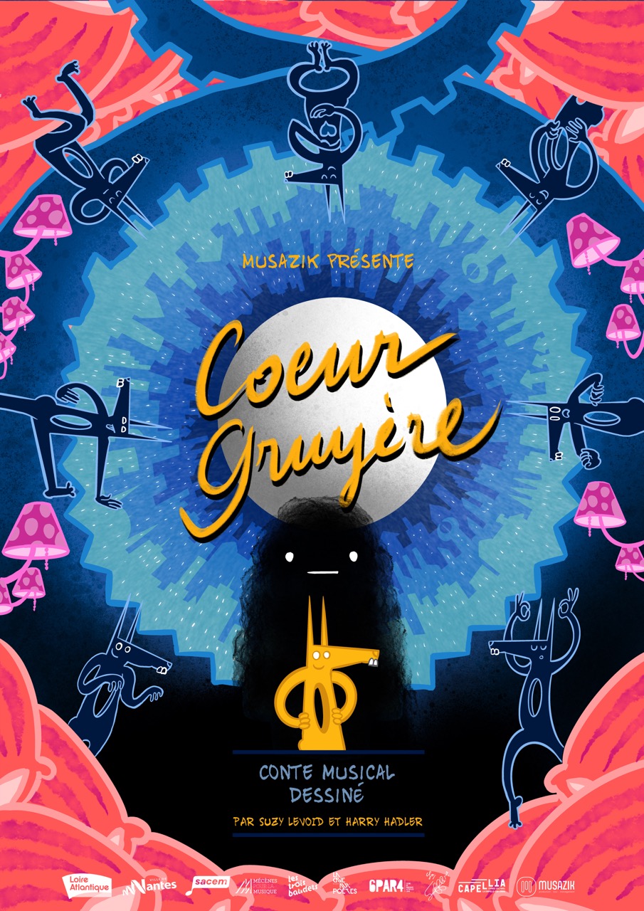 Conte musical dessiné en temps réel. Gruyère, créature moelleuse jaune poussin, traverse des mondes oniriques pour combler le vide de son cœur. Dessin, musique et récit s'entrelacent tendrement.