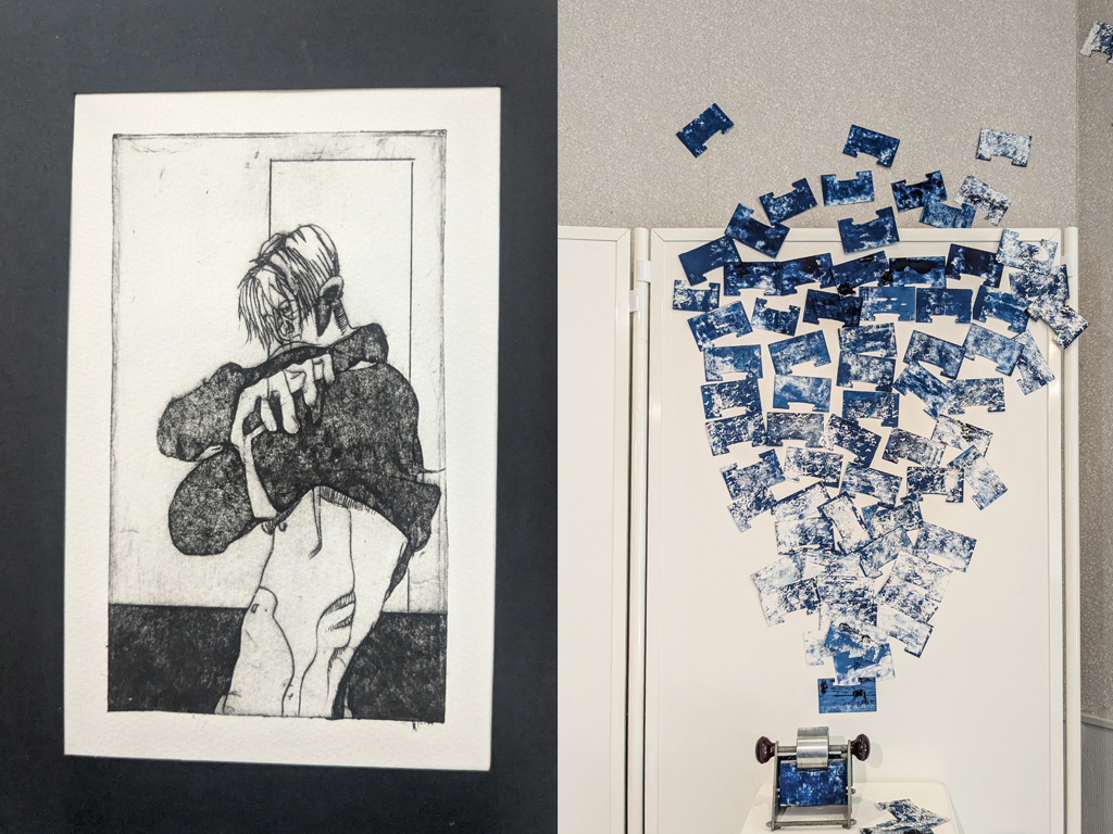 Clara Hérin et Éric Minette construisent des paysages faits de rythmes, d’accidents et de diaphanéités. Entre estampe, peinture et collage, leur travail dialogue autour du recouvrement, de la superposition et de la transparence. Clara joue avec la multiplicité des images, les fragments et la lumière, tandis qu’Éric développe un univers pictural vibrant, où les formes organiques s’animent dans une profondeur chromatique sensible.