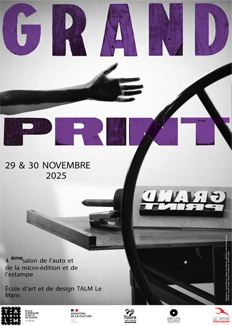 L'École supérieure d'art et de design TALM-Le Mans organise la quatrième édition de Grand Print, le salon de l'auto, micro édition et de l'estampe dans le hall de l'école, pour le grand public et les amateurs des arts du "Zine", du "Fanzine", de l'estampe, de la photocopie, du polycopié et de la risographie.