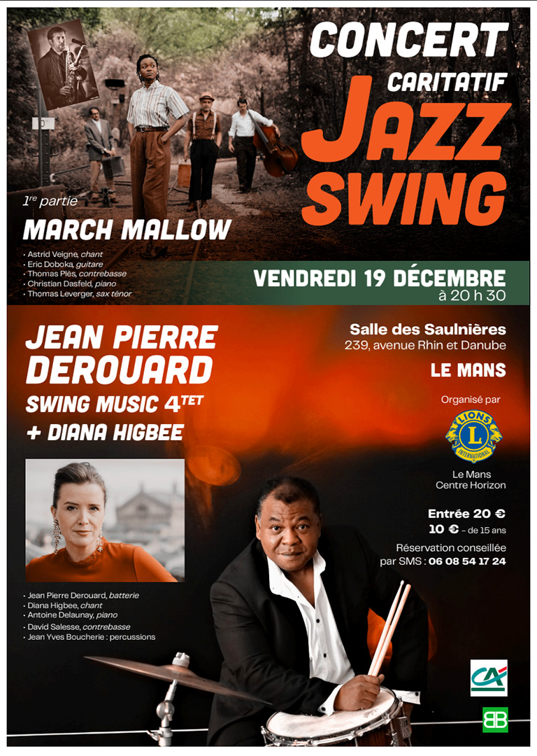 Grande soirée jazz swing organisée par le Lions Club le 19 décembre aux Saulnières, avec March Mallow, Jean-Pierre Derouard et Diana Higbee ; bénéfices reversés à des associations, réservation conseillée (20 € / 10 € -15 ans).