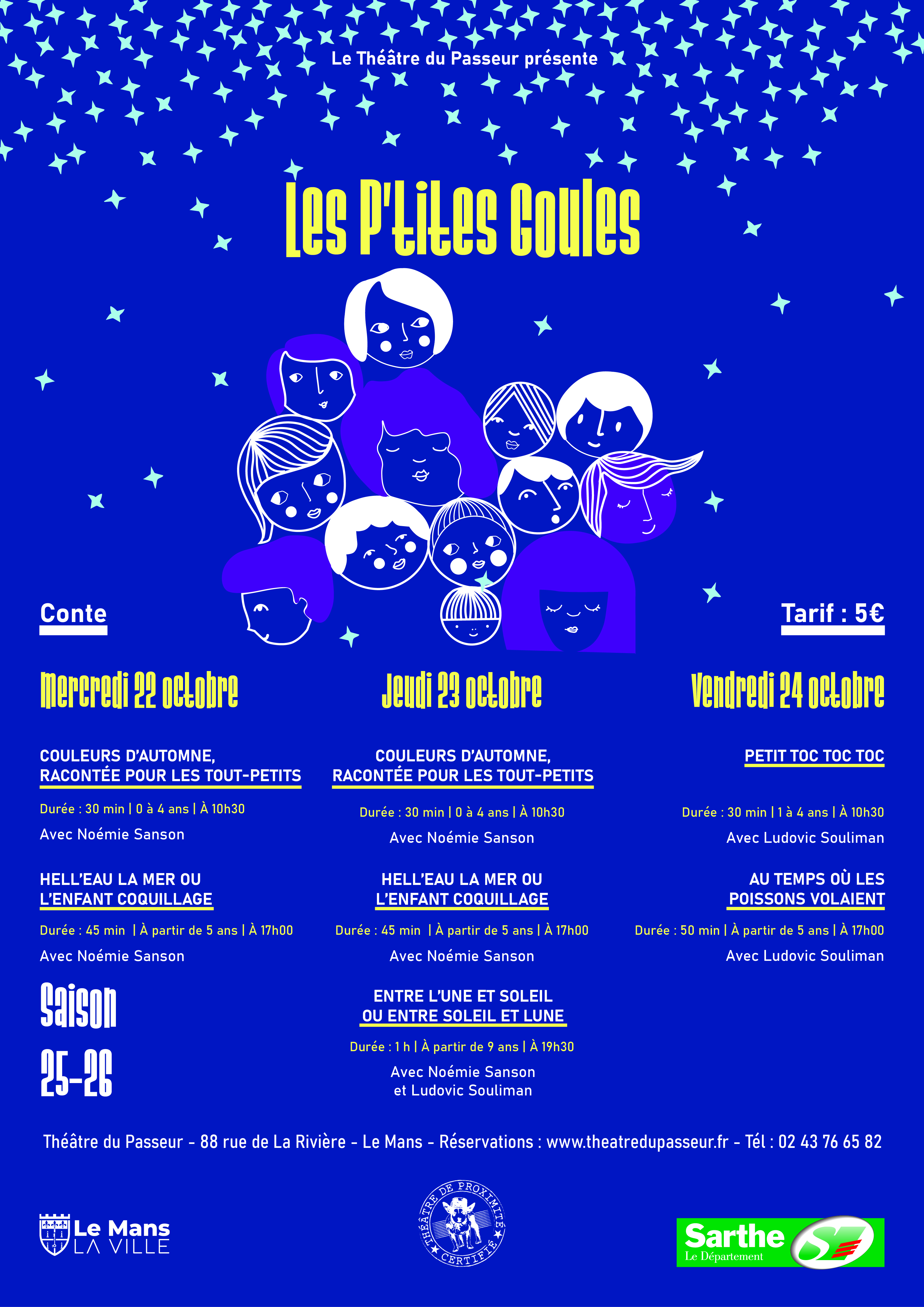 1er temps fort de la saison au Théâtre du Passeur : LES P’TITES GOULES ! Trois jours dédiés au conte et aux conteur·se·s, pour voyager en famille dans des mondes poétiques, drôles et sensibles. Chaque jour, au moins deux rendez-vous pour petites et grandes oreilles. Du 22 au 24 octobre.