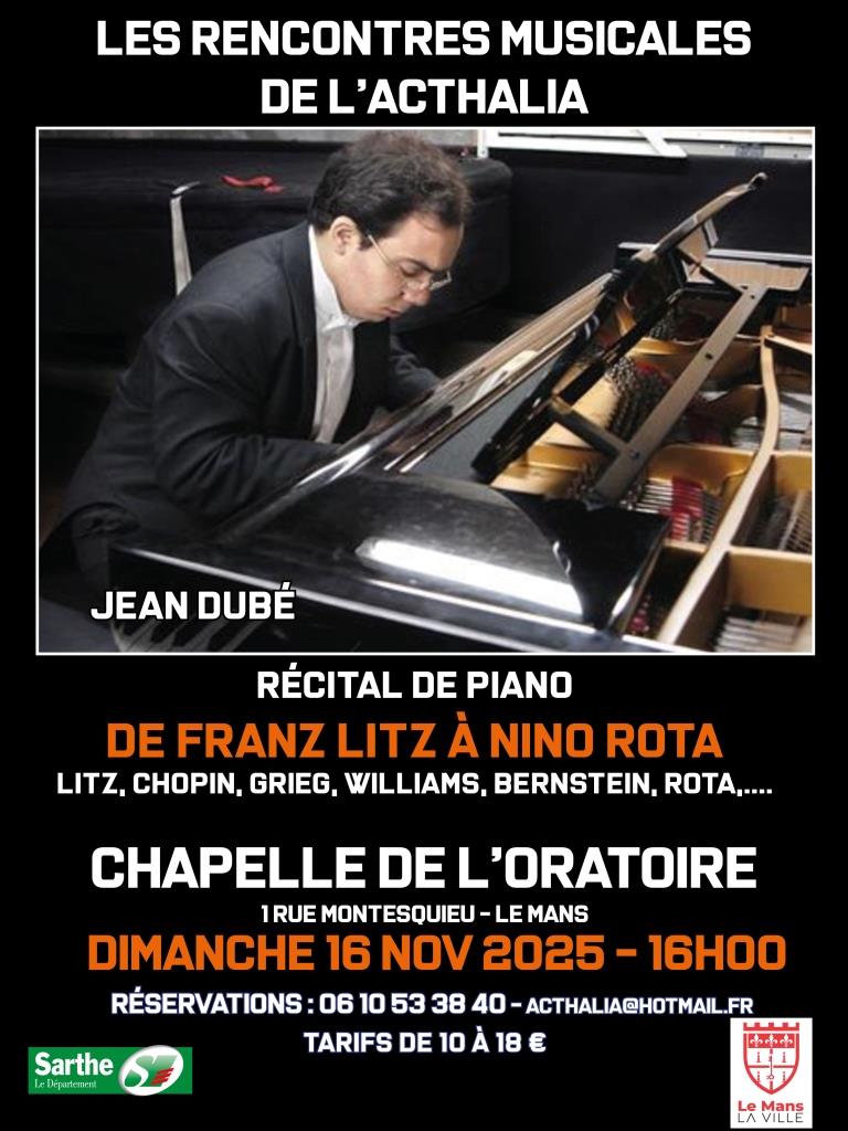 Avec un répertoire, très vaste, allant de la musique baroque aux créations contemporaines, Jean Dubé se produit dans le monde entier depuis l’âge de quatre ans. Pour ce concert exceptionnel à la Chapelle de l’Oratoire, il va nous offrir un programme très riche et varié allant de Liszt à Nino Rota en passant par Grieg, Chopin, Saint -Saëns, John Williams et Bernstein. Du classique aux musiques de films.