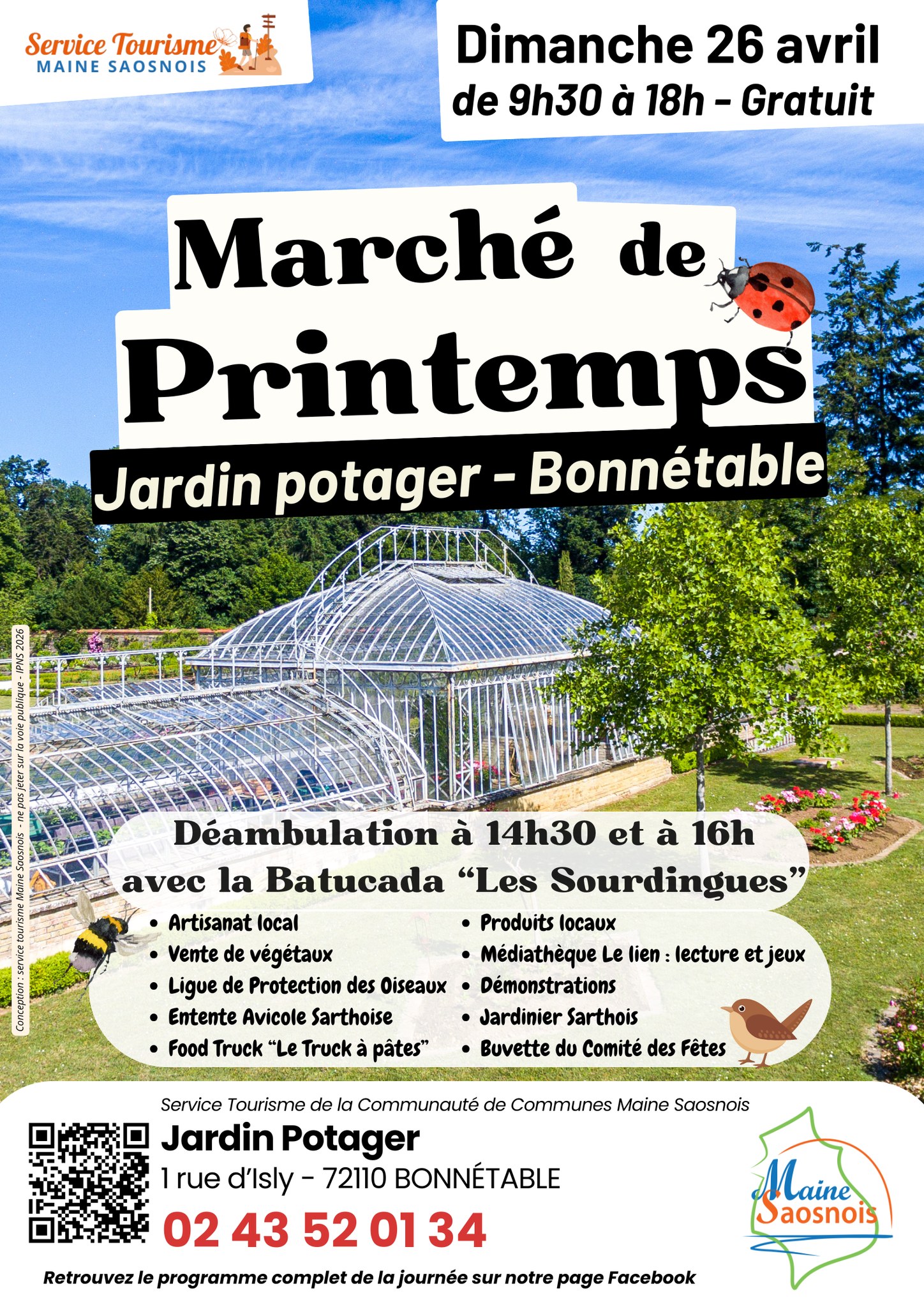 Artisanat local, vente de végétaux, présence de la LPO, de l'Entente Avicole Sarthoise, fodd truck, produits locaux, jeux, démonstrations, buvette...