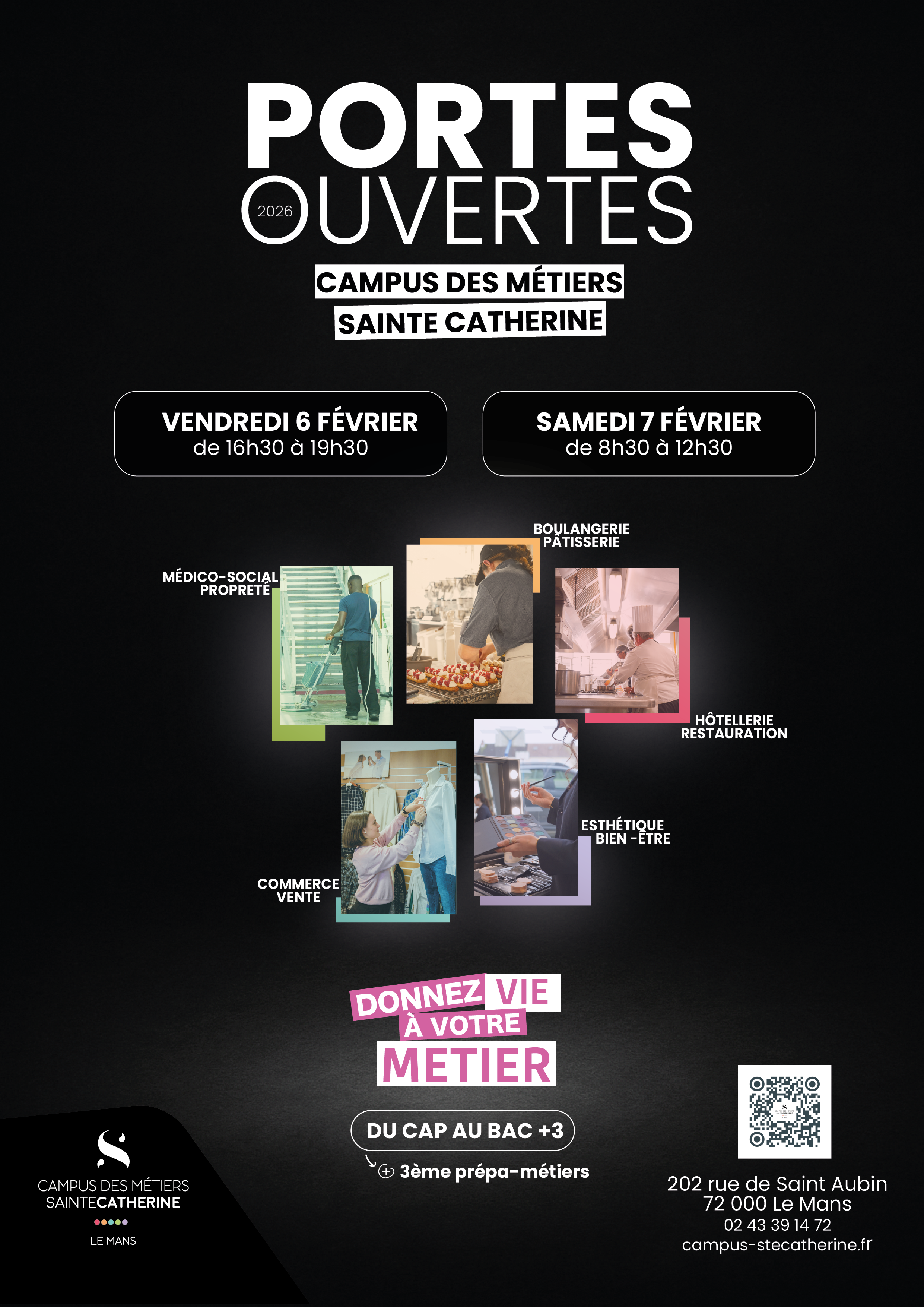 Le Campus des métiers Sainte-Catherine ouvre ses portes les vendredi 6 février, de 16 h 30 à 19 h 30 et samedi 7 février, de 8 h 30 à 12 h 30. L’occasion de découvrir ses formations dans six secteurs : hôtellerie-restauration, commerce-vente, boulangerie-pâtisserie, esthétique-bien-être, médico-social et propreté.