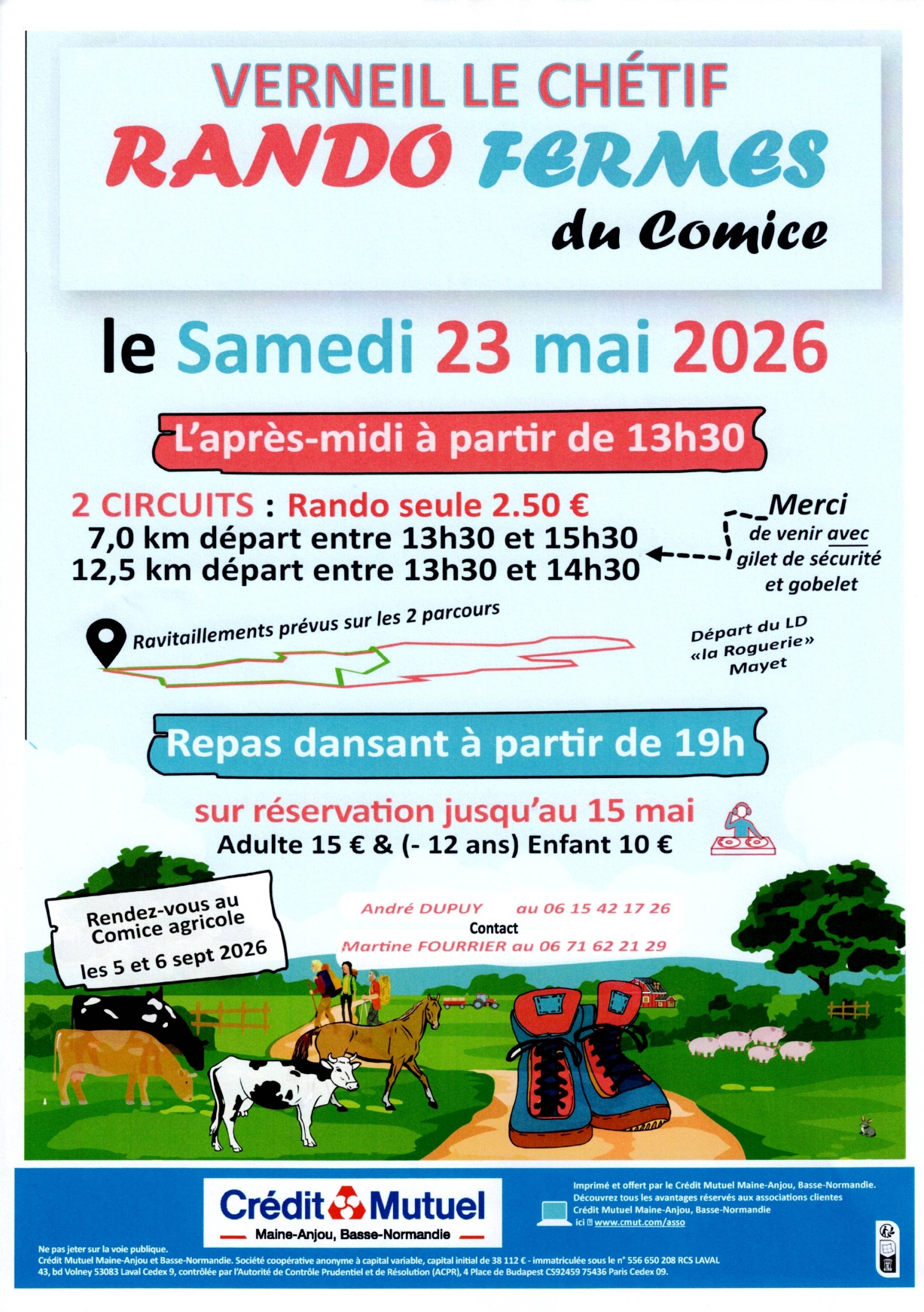 Rando fermes du comice, organisé par le comice agricole de Verneil-le-Chétif. 2€50 rando seule : 2 circuits : 7km départ entre 13h30 et 15h30 / 12,5km départ entre 13h30 et 14h30. Venir avec gilet de sécurité et gobelet. Départ du lieu-dit la Roguerie à Mayet". Repas dansant à partir de 19 sur réservation jusqu'au 15 mai 15€ adulte / 10€ enfant -12ans, rando seule, 2.50€