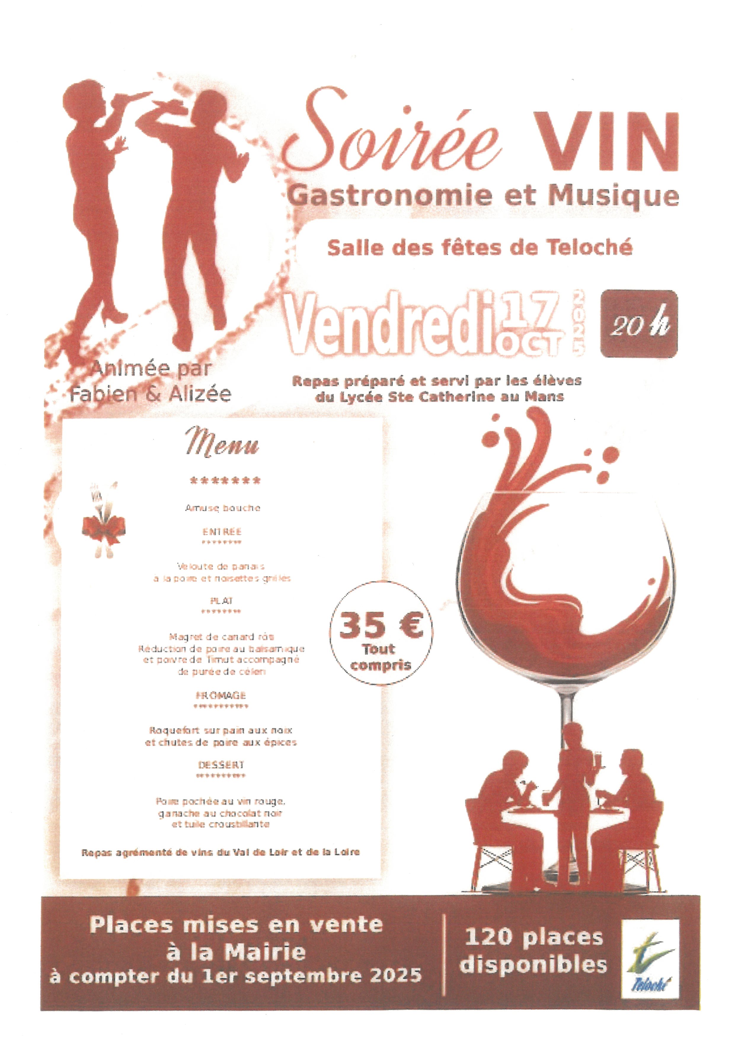 N'hésitez pas à vous rendre en mairie pour réserver votre place à la soirée "Vins, gastronomie et musique" de Teloché!