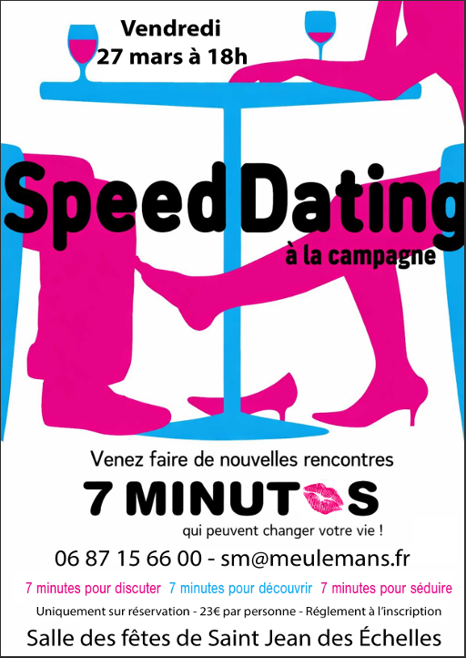 Rencontre pour célibataires de 18h à 21h. Il s’agit d’un moment où chacun rencontre toutes les personnes du sexe opposé, pendant 7 minutes. Un équilibre femmes/hommes sera respecté, un équilibre des âges aussi. 23€/pers. Il est nécessaire de réserver, par sms au 06 87 15 66 00, ou par mail à sm@meulemans.fr. Si ces équilibres ne sont pas atteints, ou bien si le nombre d’inscription est trop faible, la soirée sera annulée.