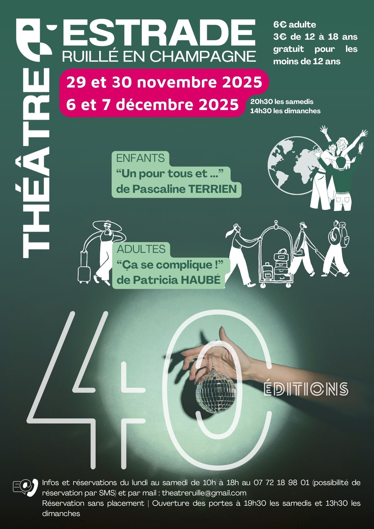 Réservations possible par SMS au 07 72 18 98 01 du lundi au samedi de 10h à 18h ou par mail : theatreruille@gmail.com.