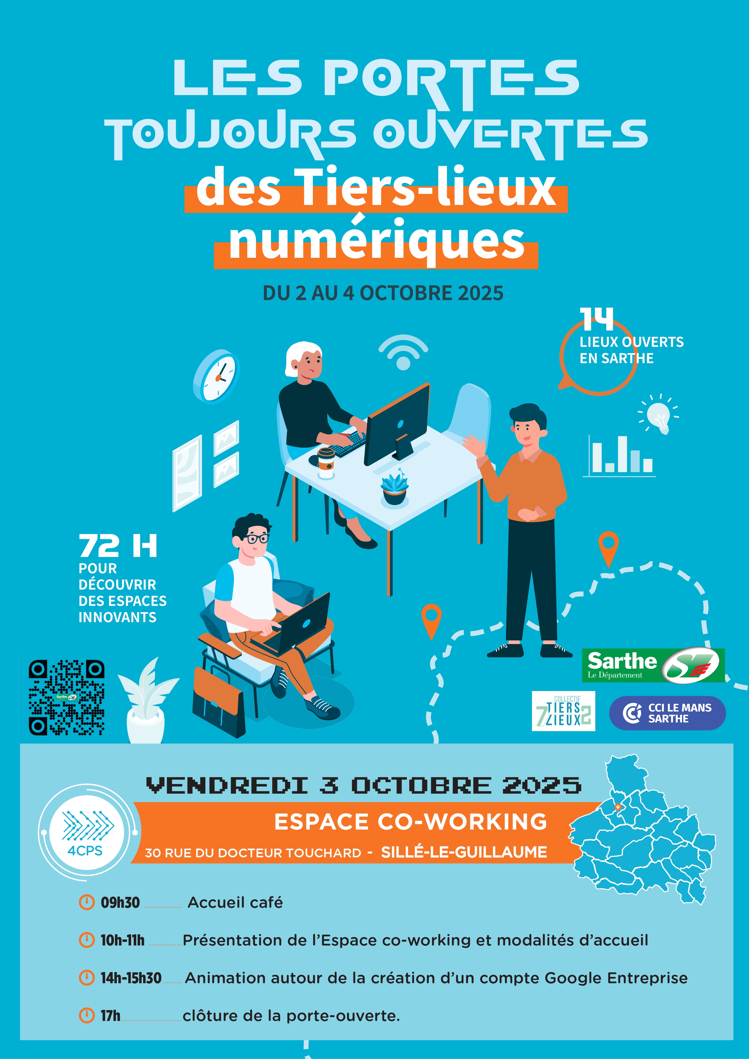 Dans le cadre des Journées Portes Ouvertes des tiers-lieux numériques en Sarthe, l’Espace Co-Working de la 4CPS vous ouvre ses portes pour une journée découverte le vendredi 3 octobre à Sillé-le-Guillaume !