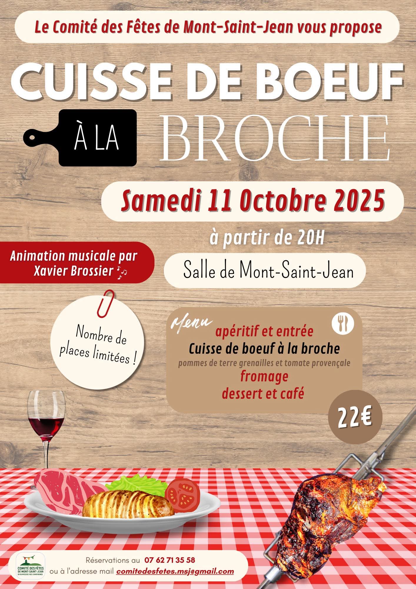 Le Comité des fêtes de Mont-Saint-Jean vous propose une soirée cuisse de bœuf à la broche !