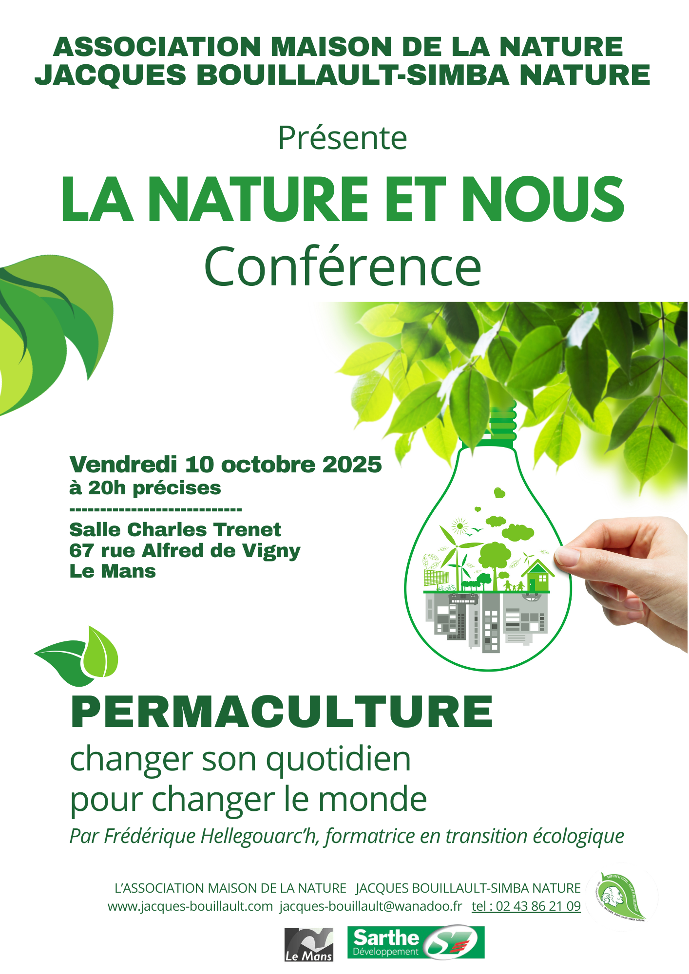 Vous êtes invités le vendredi 10 Octobre 2025 à notre troisième conférence "La Nature et nous" de l'année 2025 sur le thème de la Permaculture salle Charles Trenet 67 Rue Alfred de Vigny au Mans à 20 Heures,