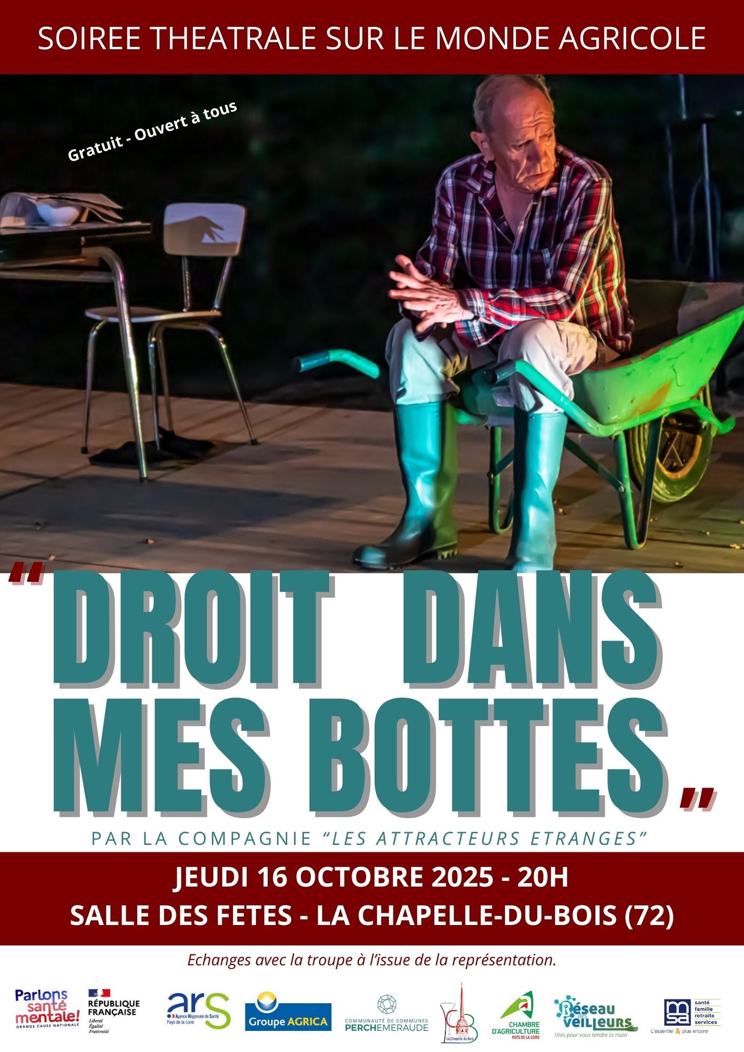 Soirée théâtre sur le monde agricole. La compagnie Les Attracteurs Étranges vous propose la pièce « Droit dans mes bottes », une immersion dans les réalités du monde agricole.