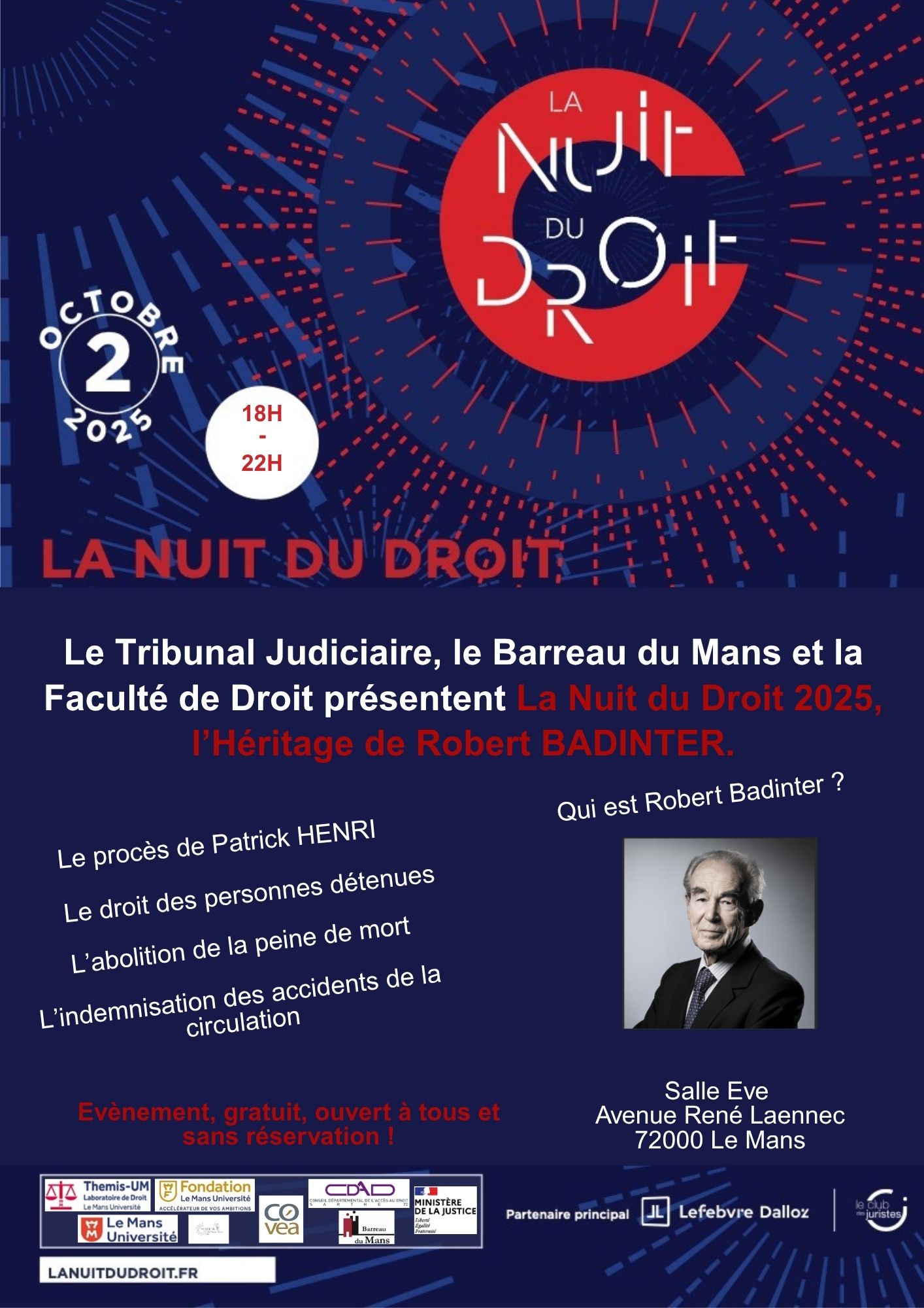À l’occasion de la Nuit du Droit 2025, le jeudi 02 octobre, le Tribunal judiciaire du Mans, le Barreau, la Faculté de Droit de l’Université du Mans et le CDAD de la Sarthe ont le plaisir de vous convier à une soirée thématique :