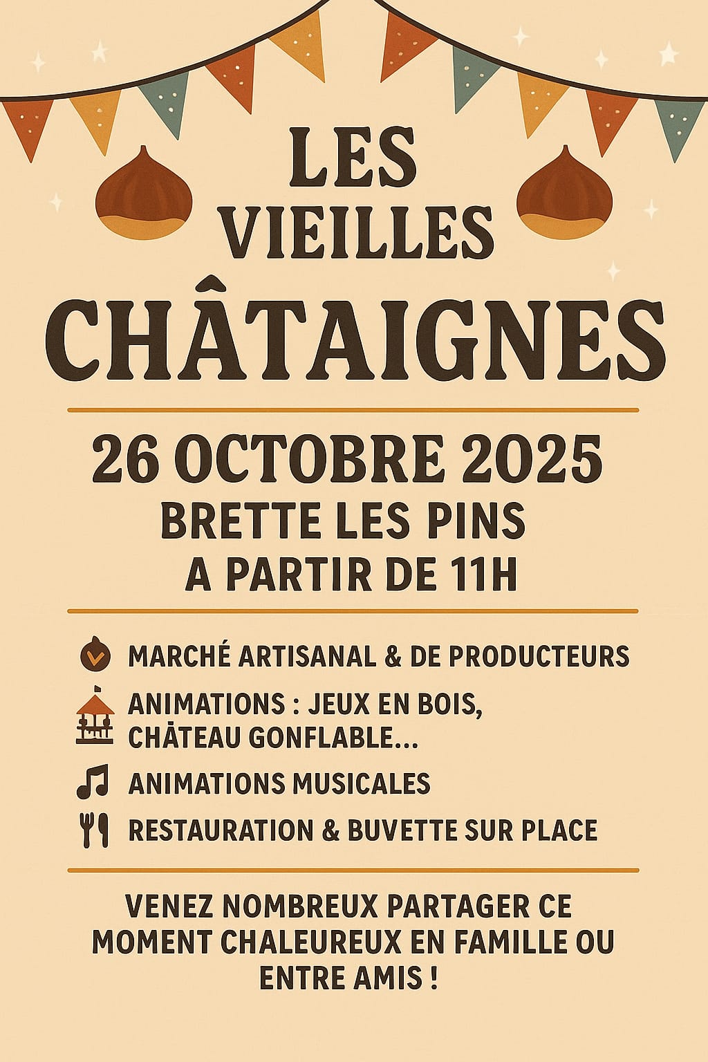 Nous vous proposons un marché artisanal, animation musicale, châtaignes grillées, restauration, ainsi que des jeux pour tout âges !