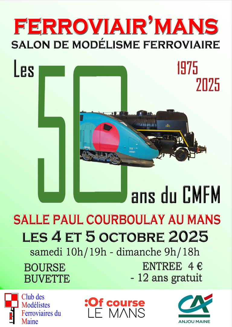 Le Club des Modélistes Ferroviaires du Maine organise un salon de modélisme ferroviaire le 4 et 5 octobre à la salle Paul Courboulay pour y fêter ses 50 ans d'existence . Une douzaine de réseaux de trains miniatures y seront présents. Bourse et buvette sur place.