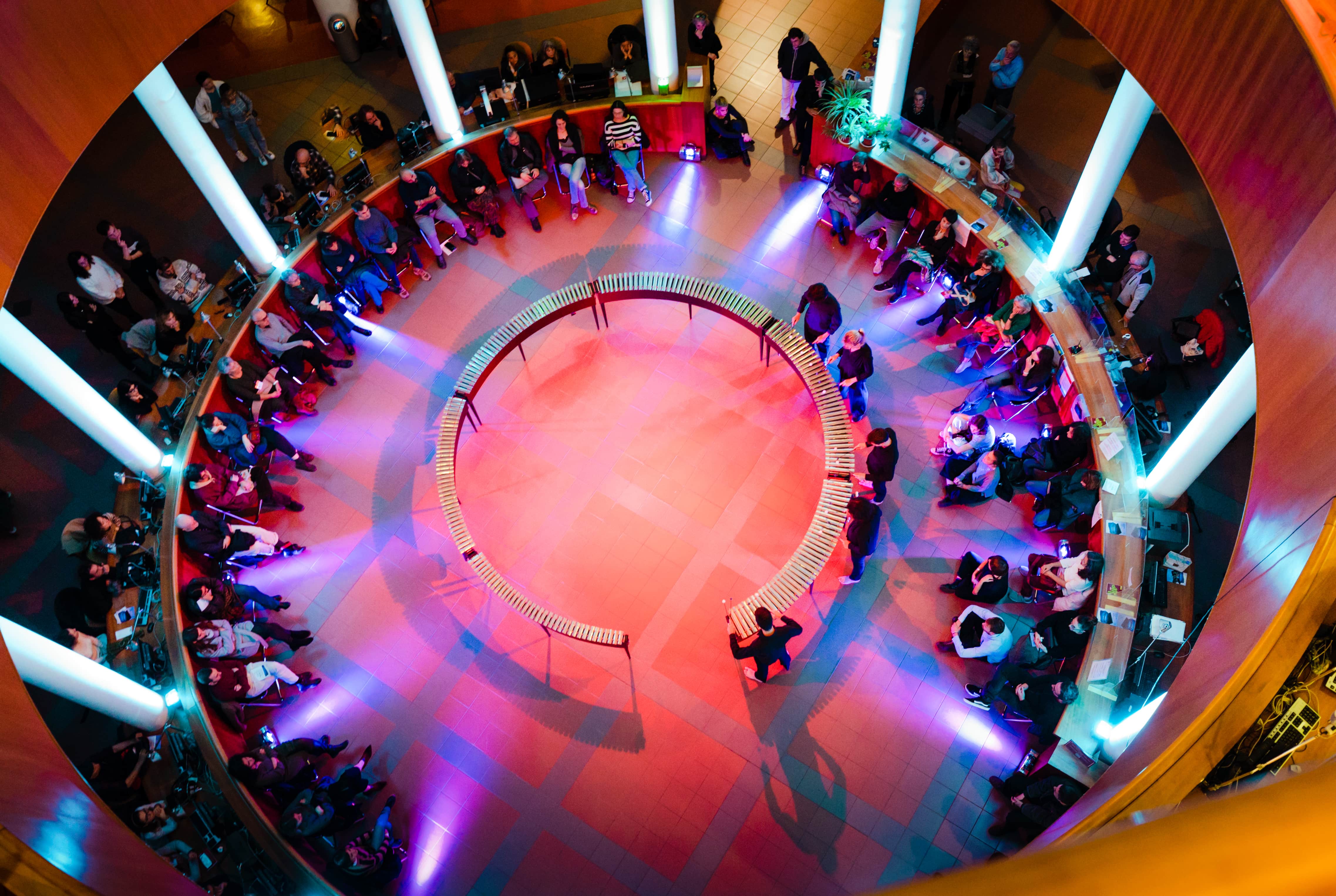 Autour d’un instrument circulaire de 15 mètres de circonférence doté de lames d’acier martelées, six percussionnistes tournoieront comme des astres autour du Soleil pour vous entraîner dans un monde inexploré peuplé de do et de ré, entre performance chorégraphique et virtuosité musicale.