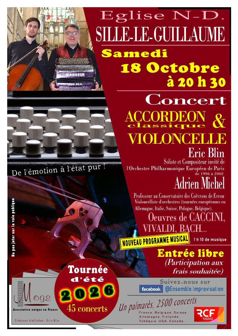 En accord avec la paroisse de Sillé le Guillaume, Notre Association «MUSIQUES ORIGINALES DE LA GRANDE EUROPE » , est très heureuse de vous faire part d'un concert de musique classique ENTREE LIBRE (avec une participation aux frais souhaitée) de l’ « Ensemble Improvisation – en duo :