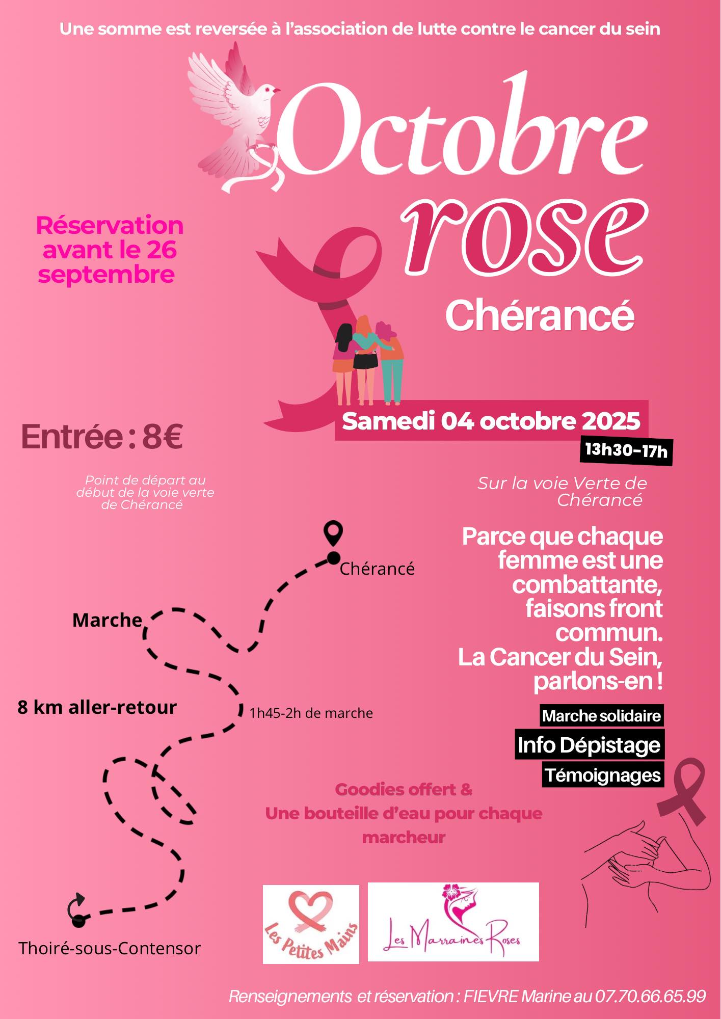 Le samedi 4 octobre, le comité des fêtes de Chérancé vous propose de participer à une marche solidaire dans le cadre d'Octobre Rose. Le circuit d'environ 8 kilomètres (aller-retour) empruntera la Voie Verte Haute Sarthe Alpes Mancelles entre Chérancé et Thoiré-sous-Contensor (environ 1h45/2h de marche). Une partie des fonds sera reversée à l’association « Les Marraines Roses ». Sur place également : l'association « Les Petites Mains », avec une vente de créations au profit de la cause.