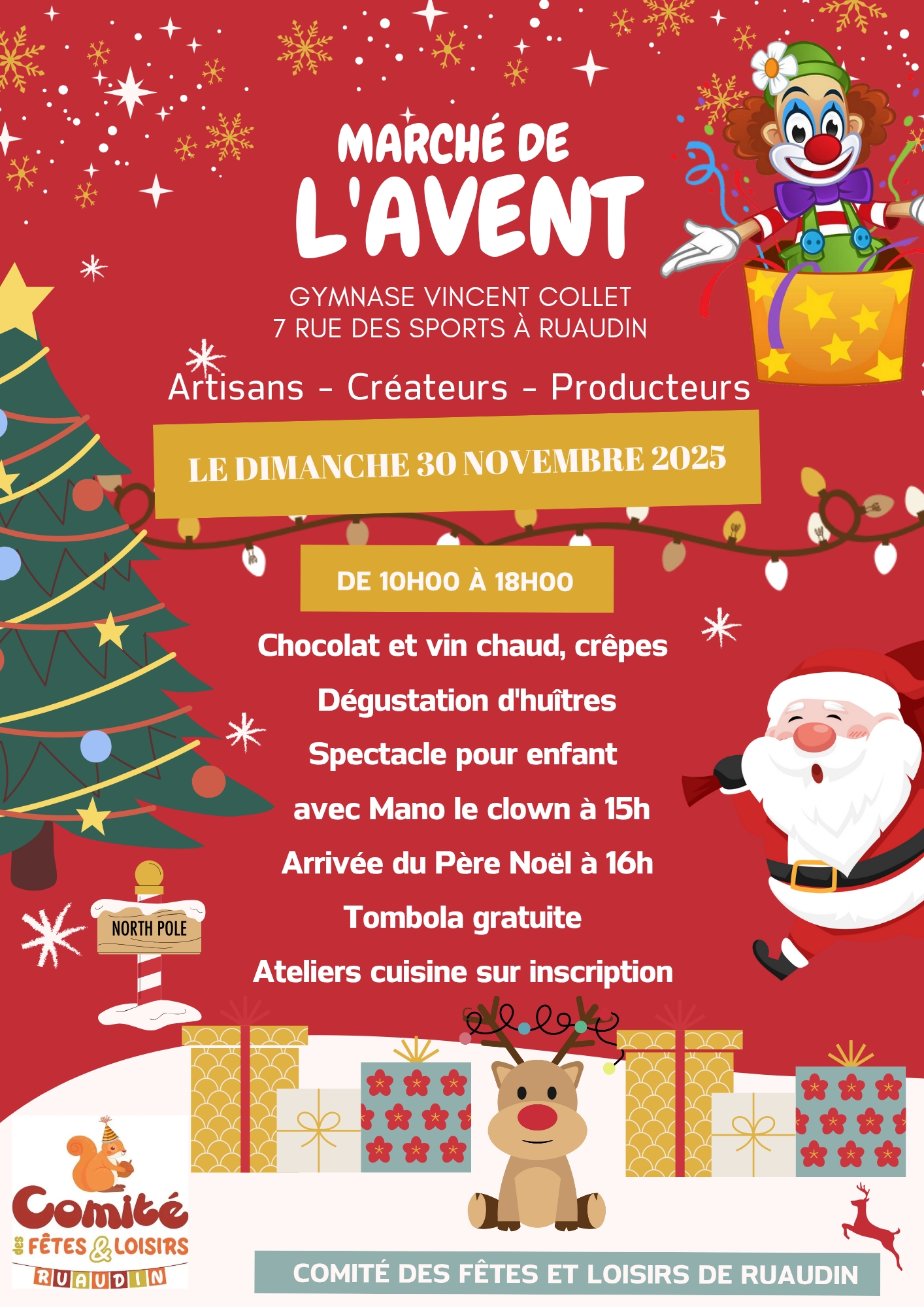 Le marché de l’Avent, organisé par le comité des fêtes et loisirs de Ruaudin aura lieu le dimanche 30 novembre de 10h à 18h au Gymnase.